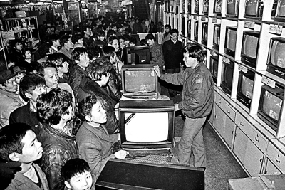 1988年2月初,隨著春節(jié)的臨近,在武漢中心百貨大樓,前來選購電視機的人群擠滿了大廳,為的是買一臺電視機回家看中央電視臺的春節(jié)晚會。圖片來源:視覺中國/光明圖片