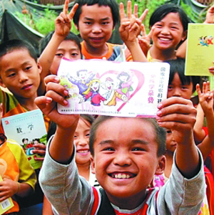 2007年9月2日,在湖南邵陽縣就讀的貴州、四川、浙江、云南籍民工子女手持“免費教育卡”,感謝當地政府給他們免除學雜費。圖片來源:視覺中國/光明圖片