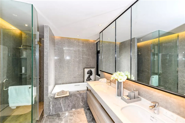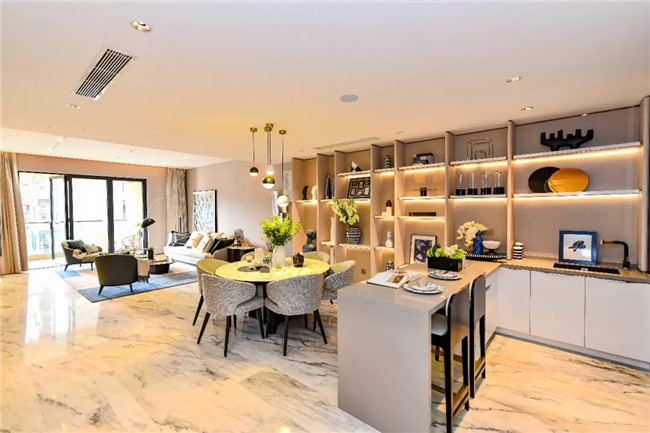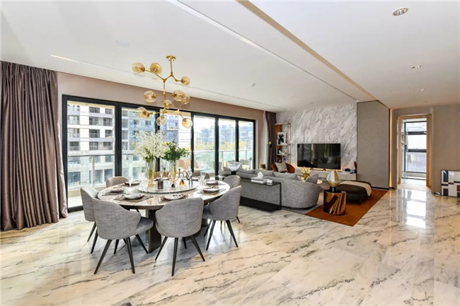 隨行工作人員,耐心地為客戶講解樣板間的品質(zhì)精裝細(xì)節(jié),光可鑒人的大理石地板凸顯主人的優(yōu)雅品味。