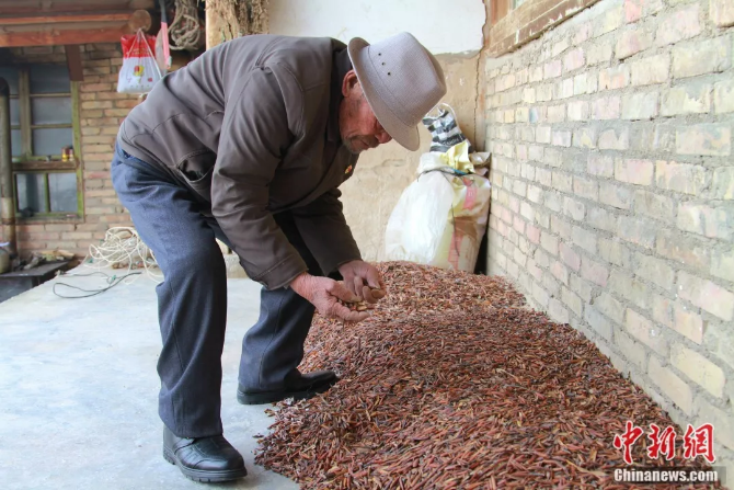 老人采集的檸條種子 李培源 攝