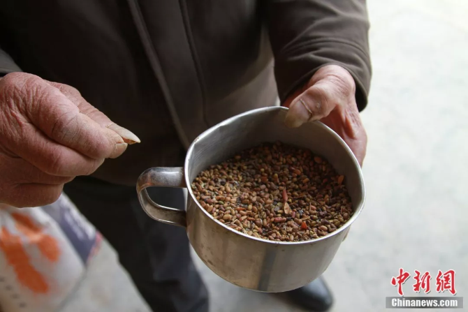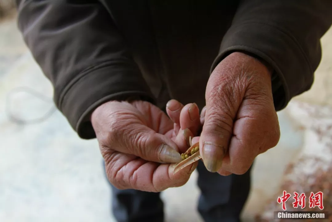 老人向我們展示檸條種子 李培源 攝