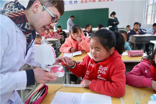 作為專業(yè)口腔醫(yī)生,來自中國臺灣的志愿者李孟哲深知兒童護齒的重要性?;顒又?李孟哲一邊用簡單易懂的方式向孩子們講解蛀牙的原理,一邊教大家科學的護牙妙招。為了活躍課堂氣氛,他還邀請學生走上講臺,借助教具現(xiàn)場實踐“刷牙”,及時糾正了孩子們錯誤的握牙刷姿勢和刷牙方法,讓他們在輕松愉悅的氛圍中吸收新知識。