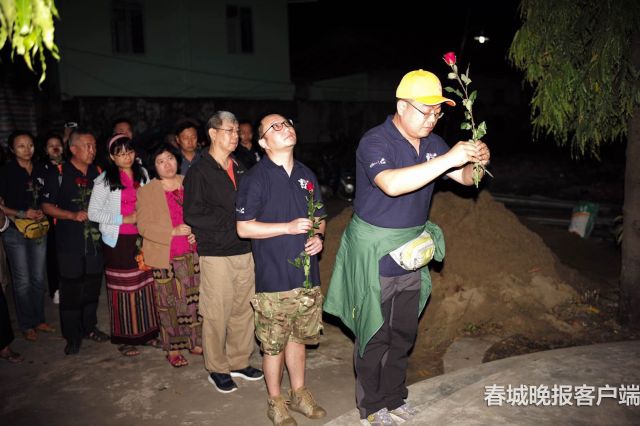 中國(guó)遠(yuǎn)征軍紀(jì)念碑座落在當(dāng)?shù)匾凰A人會(huì)館的財(cái)神廟 ——“福元宮”的后院里??疾靻T在13日夜趕到了這里,夜色下的紀(jì)念碑巍然矗立,莊嚴(yán)肅穆,每人都在這里獻(xiàn)上了一束鮮花,表達(dá)對(duì)英烈們的敬意。
