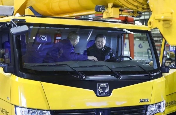 起重機噴繪成亮黃色,剛剛下線,重達54.99噸。這個龐然大物能伸出七節(jié)73米主臂,輕松應付油田、碼頭與橋梁工地上諸多工程。駕駛室極為寬敞,寬近3米,習近平坐在方向盤前,同技術(shù)人員詳細聊起了這臺“完全由徐工集團自主研發(fā)、擁有30多項專利、打入多個發(fā)達國家市場”的起重機。
