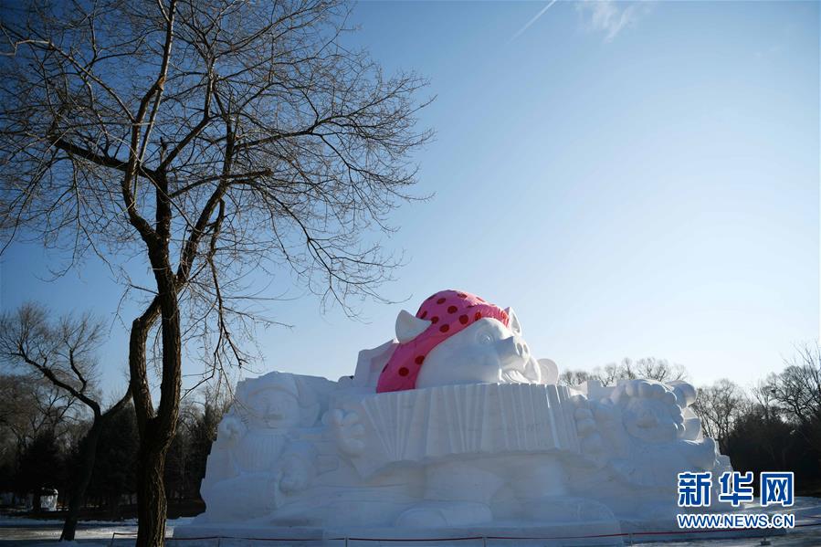12月17日拍攝的“歡樂金豬”主題雪雕。