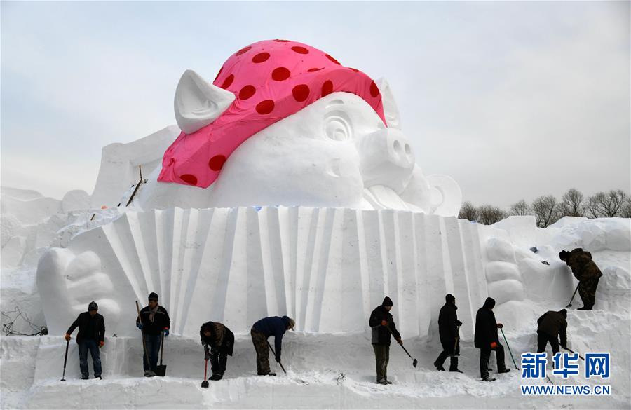 雪雕師在制作“歡樂金豬”主題雪雕(12月12日攝)。