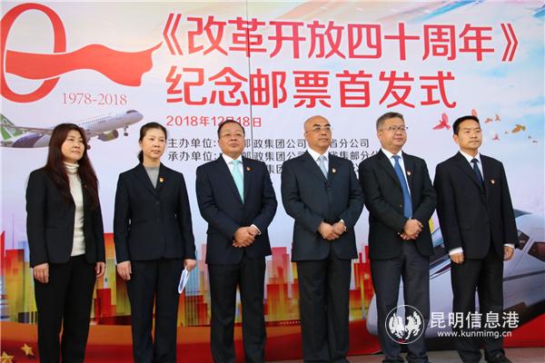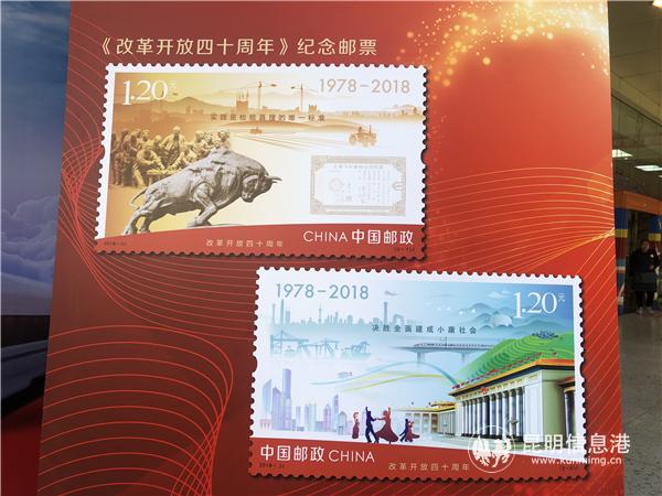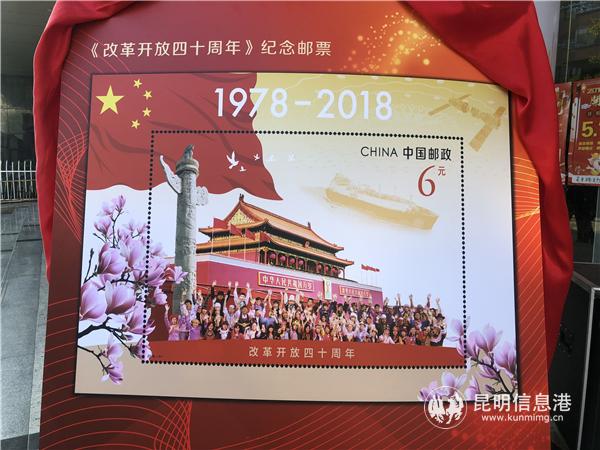 昆明信息港訊 記者甘凌菲 12月18日上午,《改革開放四十周年》紀(jì)念郵票首發(fā)式在云南郵政業(yè)務(wù)綜合大樓舉行。本次發(fā)行的郵票共1套2枚,小型張1枚,郵票圖案名稱分別為“高舉旗幟”和“偉大實(shí)踐”,小型張圖案名稱為“筑夢新時代”,全套郵票面值8.40元。