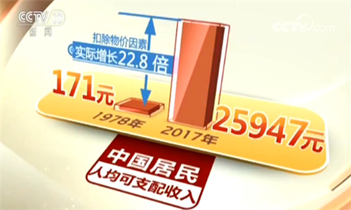 ?(民生)——1978年到2017年,中國居民人均可支配收入從171元增長到25947元,扣除物價因素,實際增長22.8倍。40年間,貧困人口減少7.4億,減貧人口占同期全球減貧總數(shù)70%以上。(央視網(wǎng))