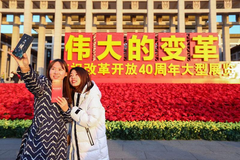 12月18日,參觀者在“偉大的變革——慶祝改革開(kāi)放40周年大型展覽”外自拍留影。新華社記者張玉薇/攝