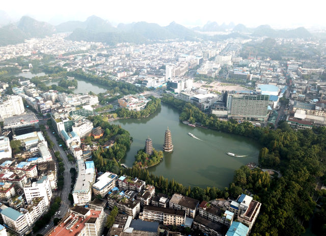 游船在廣西桂林市杉湖湖面上穿行(10月17日無人機拍攝)。新華社 記者周華/攝