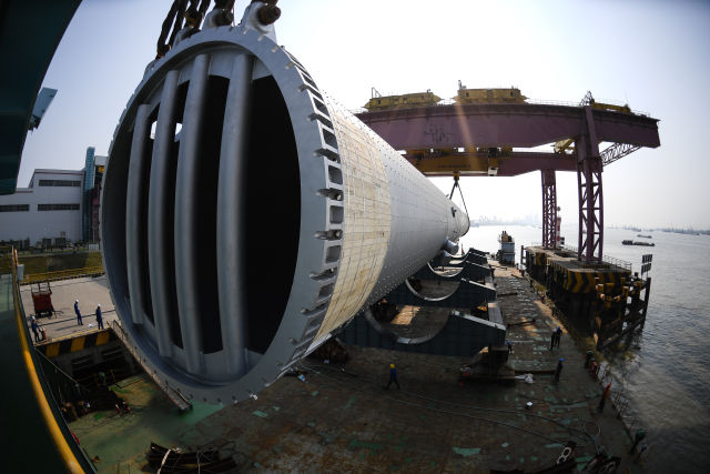 在江蘇鎮(zhèn)江,260萬噸/年沸騰床渣油鍛焊加氫反應(yīng)器正在進行吊裝(4月28日攝)。新華社 記者李響/攝