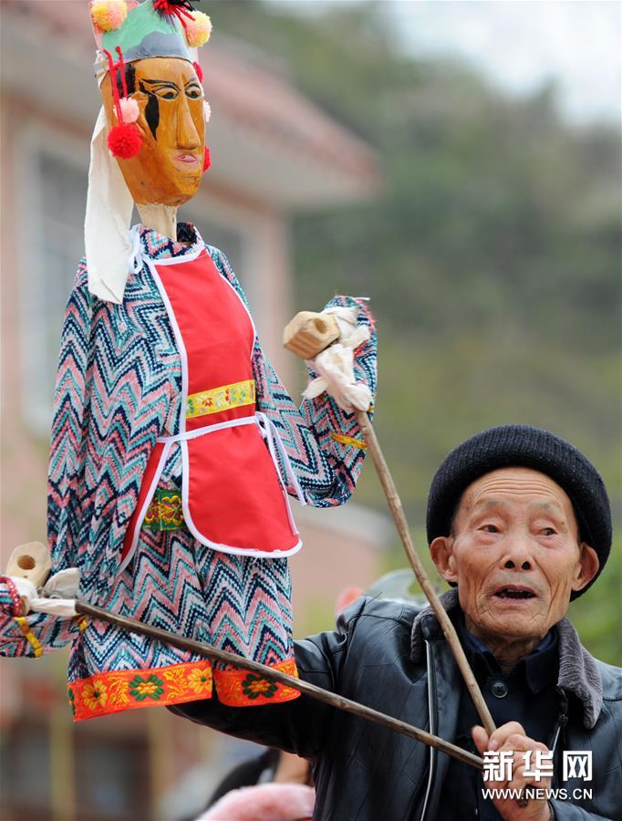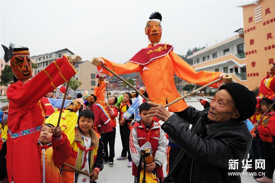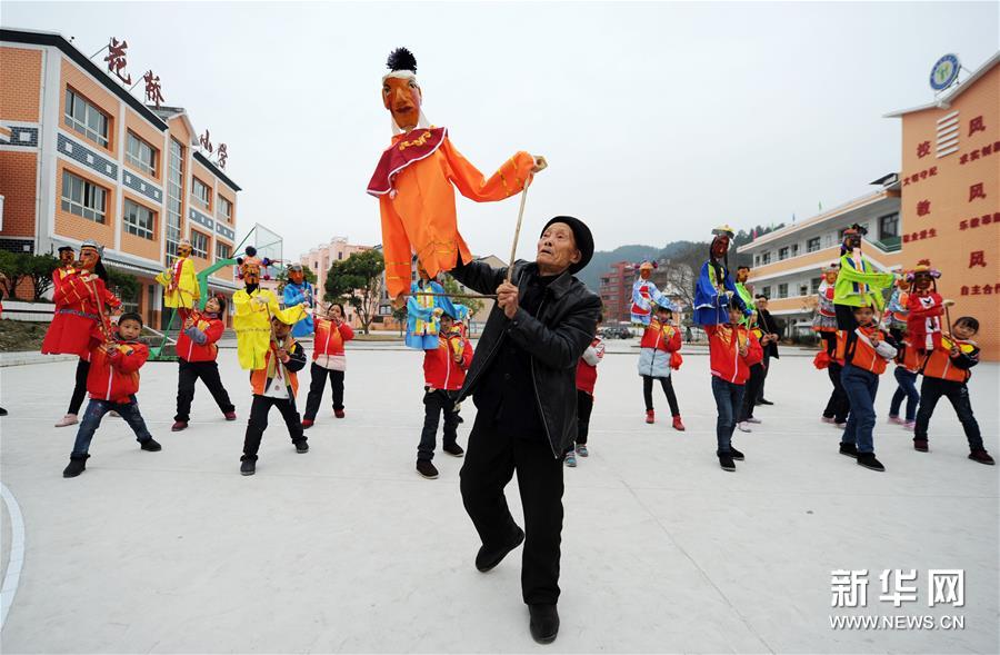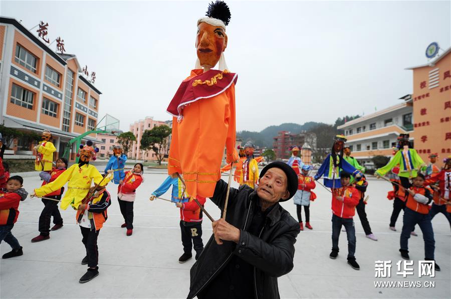 12月19日,在貴州省石阡縣花橋鎮(zhèn)小學(xué),傳承人傅正貴在指導(dǎo)學(xué)生練習(xí)石阡木偶戲。 近年來,為傳承和保護(hù)石阡木偶戲,貴州省石阡縣將木偶戲引入校園,定期邀請(qǐng)傳承人到學(xué)校為師生指導(dǎo)授課。學(xué)校還通過興趣活動(dòng)課、課間集體展示等方式,讓石阡木偶戲這一古老民間藝術(shù)形式在校園中得以展示和傳承。 石阡木偶戲是流傳于貴州省石阡縣的一種傳統(tǒng)傀儡戲曲劇種,2006年被列入第一批國(guó)家級(jí)非物質(zhì)文化遺產(chǎn)名錄。新華社發(fā)(楊文斌/攝)