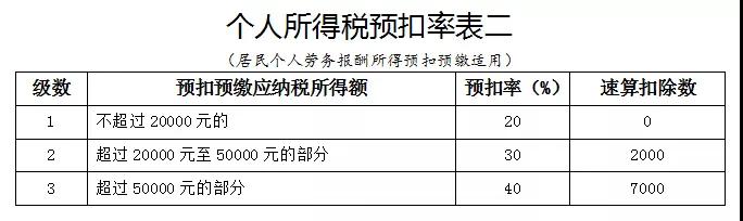 應納稅所得額:勞務報酬所得、稿酬所得、特許權使用費所得,以每次收入額為預扣預繳應納稅所得額。勞務報酬所得適用百分之二十至百分之四十的超額累進預扣率,稿酬所得、特許權使用費所得適用百分之二十的比例預扣率。