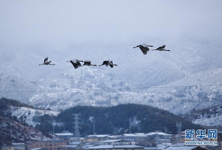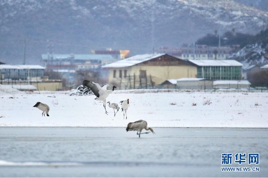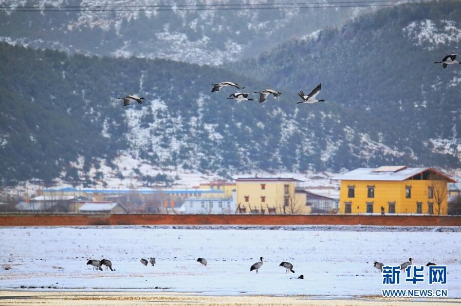 納帕海自然保護區(qū),雪地里的“小精靈”黑頸鶴。(新華網(wǎng)發(fā) 崔永江/攝)