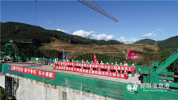 昆明信息港訊 記者上官艷君 12月21日,記者從中國鐵路昆明局集團滇南鐵路建設(shè)指揮部獲悉,21日2時16分,中老國際通道玉溪至磨憨鐵路關(guān)坪雙線大橋合龍,標志著中國電建水電十四局承建的玉磨鐵路15標段主體工程基本完工,轉(zhuǎn)入路基和橋隧附屬工程施工,成為全線首個主體工程完工的標段。