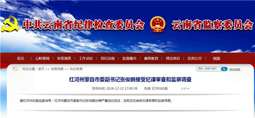 昆明信息港訊 紅河州紀(jì)委監(jiān)委消息,紅河州蒙自市委副書(shū)記張俊鵬涉嫌嚴(yán)重違紀(jì)違法,目前正在接受紀(jì)律審查和監(jiān)察調(diào)查。