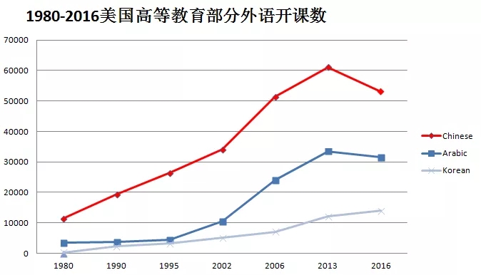 根據(jù)美國(guó)現(xiàn)代語(yǔ)言學(xué)會(huì)報(bào)告數(shù)據(jù),1980年中文在美國(guó)高等教育體系中的開課數(shù)為11366門,2016年為53069門。