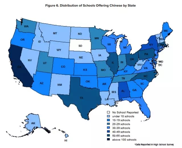 2017年《國(guó)家初中等教育外語(yǔ)教學(xué)報(bào)告》圖示。顏色越深教授中文的學(xué)校越多。