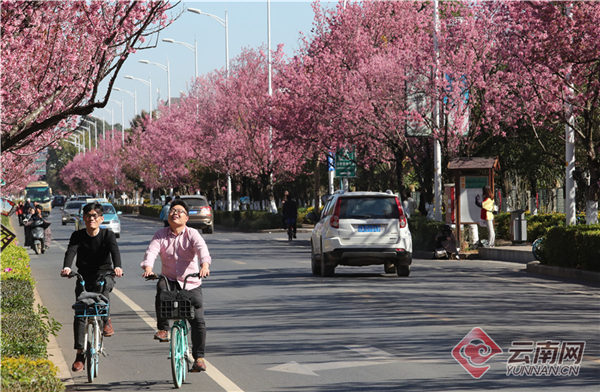 紅塔西路冬櫻花綻放,粉如霞美如畫,成為市民游人觀賞冬櫻花的“網(wǎng)紅”街。