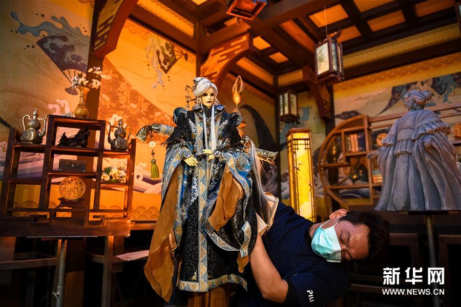 12月21日,工作人員在臺灣云林的影棚操縱霹靂布袋戲人偶。新華社記者李響攝