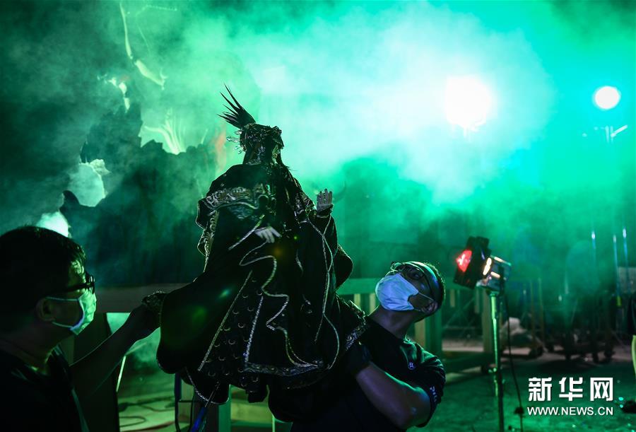 記者走進位于云林縣土庫鎮(zhèn)的霹靂國際大型攝影棚,操偶師、攝像師、布景師、道具師等劇組人員正忙碌著。一尊碩大的無頭半人馬形雕塑手拿金剛杵,在綠色光影與白色煙霧籠罩下,彌漫著神秘恐怖的氣氛。跟隨著對白講述的劇情,一具布袋戲人偶就在操偶師手中上下翻飛躍動。