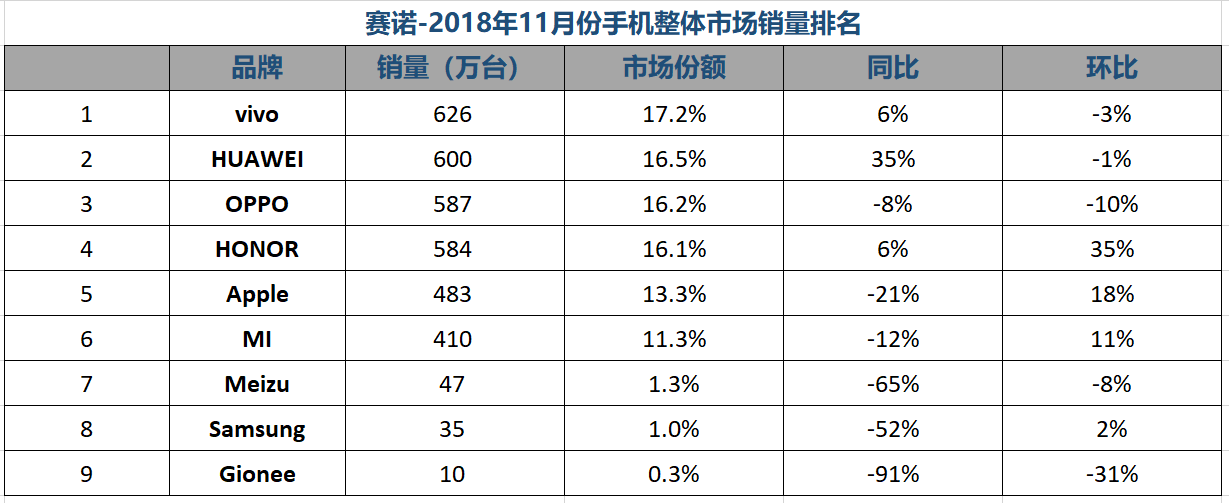 日前,賽諾11月手機市場數(shù)據(jù)出爐。根據(jù)報告顯示,截至2018年11月,中國智能手機整體市場尚未回暖,市場容量為3628萬部,同比下降12.6%。據(jù)信通院公開數(shù)據(jù),2018年1-11月國內(nèi)手機市場出貨量為3.79億部,同比下降15.6%。這些數(shù)據(jù)無不拷問著國內(nèi)手機市場:寒冬已至,何以度過。