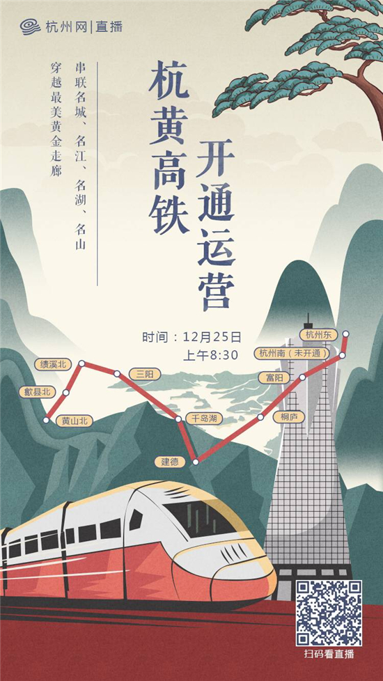 為了實地探訪杭黃高鐵運營情況,體驗世界級黃金旅游高鐵線的魅力,杭州網(wǎng)將于今天上午8點半同步推出杭黃高鐵開通運營網(wǎng)絡(luò)直播,帶你乘著高鐵穿越湖光山色,感興趣的網(wǎng)友可以實地或者通過二維碼在直播中與我們進(jìn)行互動,聊一聊杭黃高鐵的一些小故事。