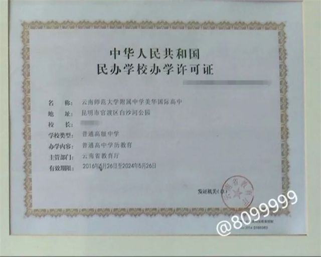 記者在云南師大附中美華國際高中的民辦學(xué)校辦學(xué)許可證上看到,有效期從2016年5月到2024年5月。
