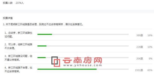 其中參與云南房網(wǎng)微信公眾號(hào)(微信號(hào):ynhouse52)投票的市民共有2374人,認(rèn)為新三環(huán)線路不合理,不應(yīng)該修高架的有1551票,占比65%;認(rèn)為應(yīng)該修,新三環(huán)線路沒問題的有389票,占比16%;認(rèn)為可以修,但新三環(huán)線路不太合理的有228票,占比10%;還有206票認(rèn)為新三環(huán)線路沒問題,但不建議修高架,占投票總?cè)藬?shù)的9%。