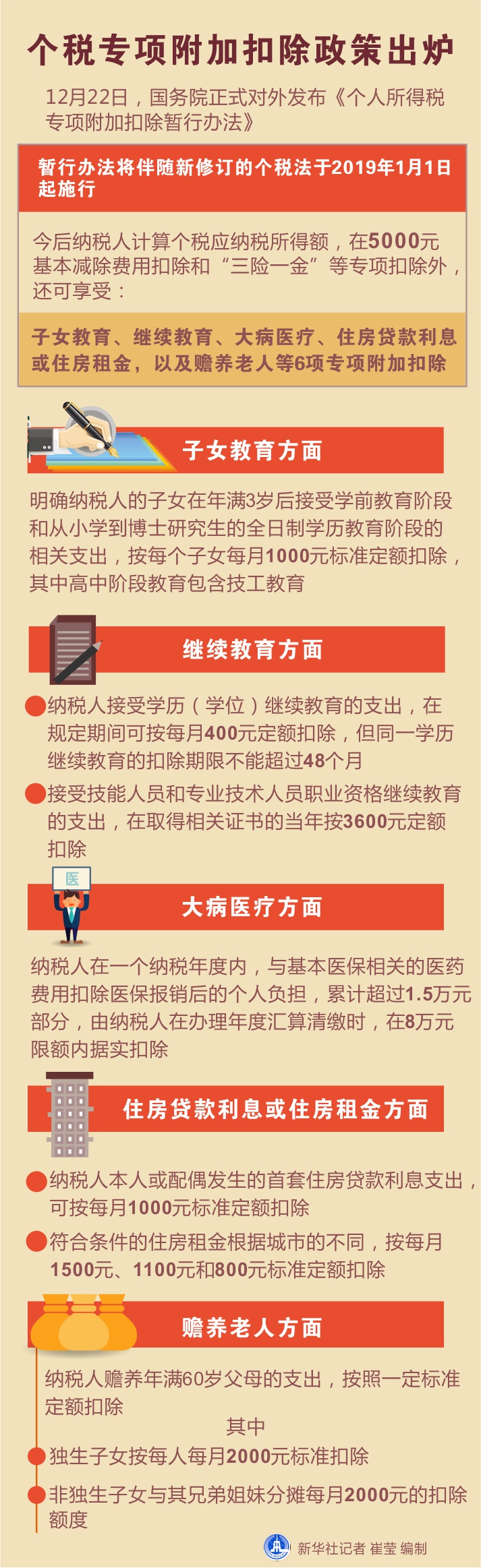 暫行辦法將伴隨新修訂的個稅法于2019年1月1日起施行。今后納稅人計算個稅應納稅所得額,在5000元基本減除費用扣除和“三險一金”等專項扣除外,還可享受子女教育、繼續(xù)教育、大病醫(yī)療、住房貸款利息或住房租金,以及贍養(yǎng)老人等6項專項附加扣除。如子女教育方面,明確納稅人的子女在年滿3歲后接受學前教育階段和從小學到博士研究生的全日制學歷教育階段的相關支出,按每個子女每月1000元標準定額扣除,其中高中階段教育包含技工教育。
