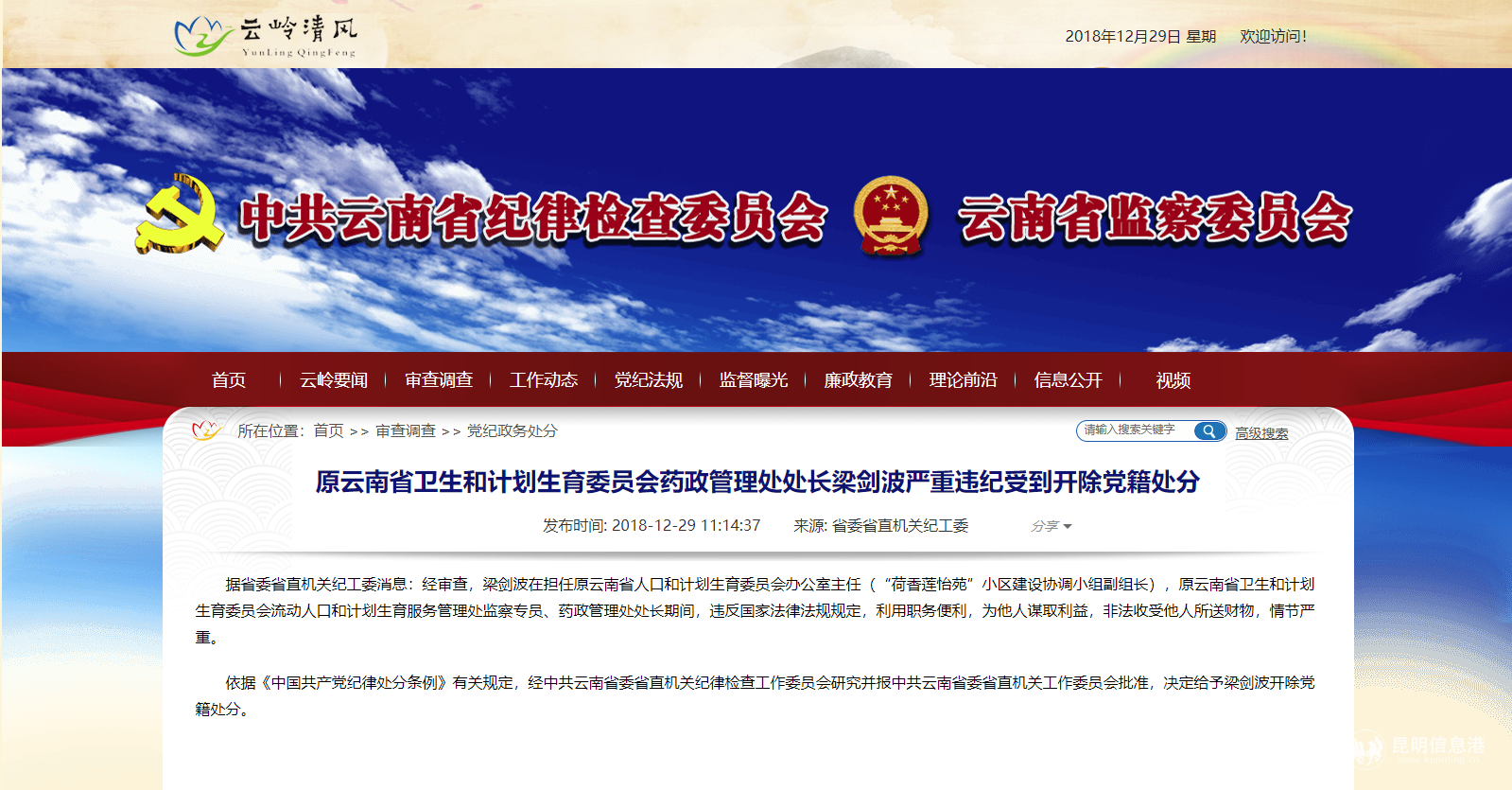 昆明信息港訊 12月29日,記者從云南省紀(jì)委監(jiān)委獲悉,原云南省衛(wèi)生和計(jì)劃生育委員會(huì)藥政管理處處長梁劍波嚴(yán)重違紀(jì)受到開除黨籍處分。