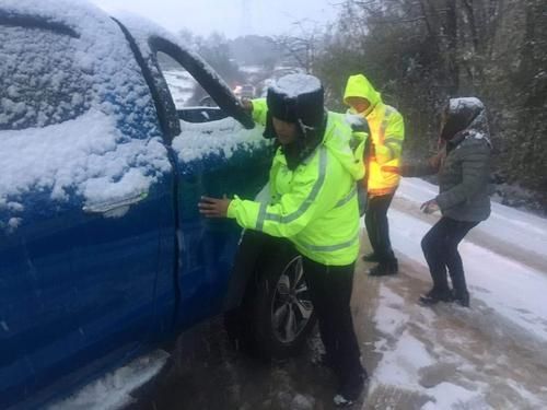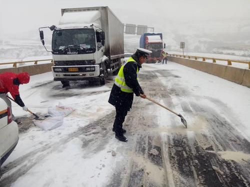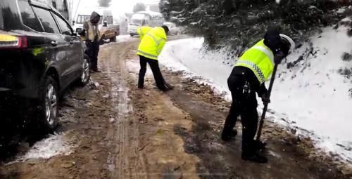 各地交警全員出動上路,鏟雪、播撒融雪劑等,頂風(fēng)冒雪疏散交通,幫助風(fēng)雪路上打滑及事故車輛推車。風(fēng)雪里,交警們的身影讓大雪天的行車人倍感溫暖。