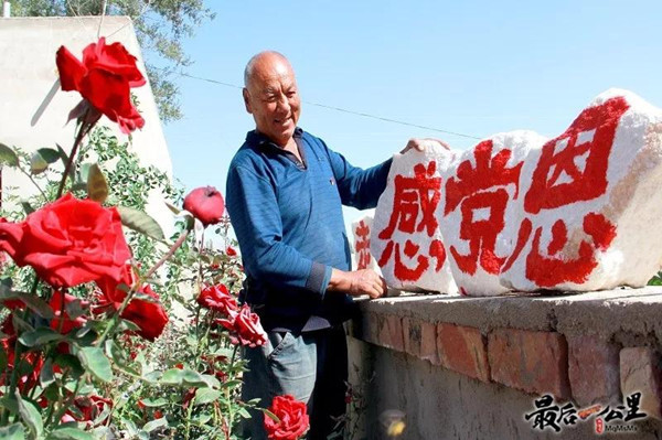 老黨員王華明在自家庭院的花墻擺放寫有“不忘初心、牢記使命”“感黨恩 聽黨話 跟黨走”的石頭。