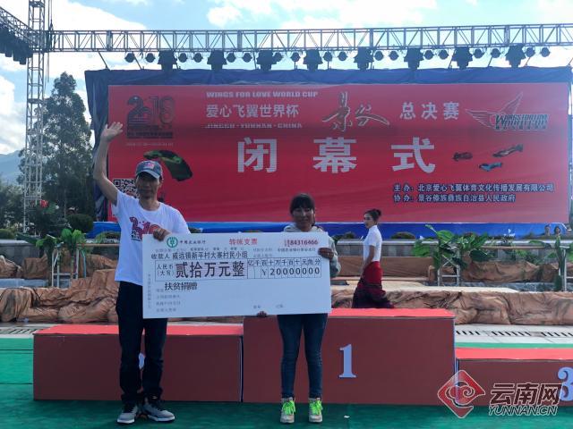 閉幕式上,2018愛心飛翼世界杯景谷總決賽總裁判長麥爾斯?戴瑟先生宣布比賽成績,同時,還舉行了愛心捐贈儀式,中國隊隊長盛廣強(qiáng)先生代表參賽運(yùn)動員向威遠(yuǎn)鎮(zhèn)新平村大寨村民小組捐贈本次參賽全部獎金20萬元人民幣。