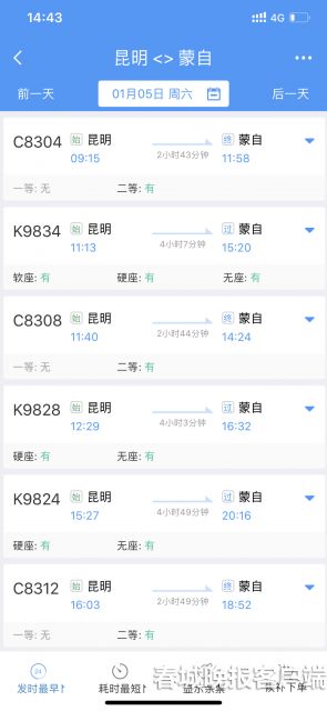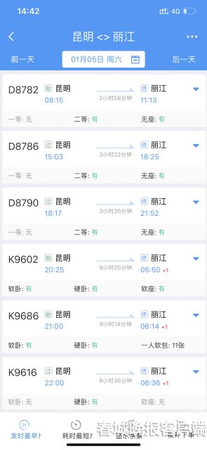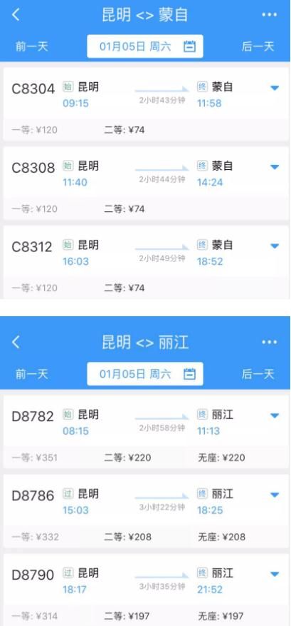 記者在12306網(wǎng)站上查詢看到,1月5日當(dāng)天昆明至麗江動車組二等座票價208元,耗時從3小時-3.5小時。而昆明到麗江的普通列車需要8.5-9.5個小時的行車時間,硬臥票價為141.5元。