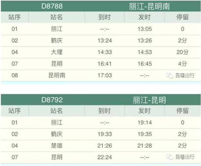 關(guān)于??空军c(diǎn),晚報(bào)記者在12306網(wǎng)站上查詢1月6日昆明至麗江動車組發(fā)現(xiàn),不同時刻的動車組??空拘畔⒉惶粯?例如,D8782次動車組早上8:15從昆明站出發(fā),11:13抵達(dá)麗江站,中間沒有???。而D8786次動車組14:40從昆明南站出發(fā)、14:58抵達(dá)昆明站、15:59抵達(dá)楚雄站、16:41抵達(dá)祥云站、17:59抵達(dá)鶴慶站、18:25抵達(dá)麗江站。
