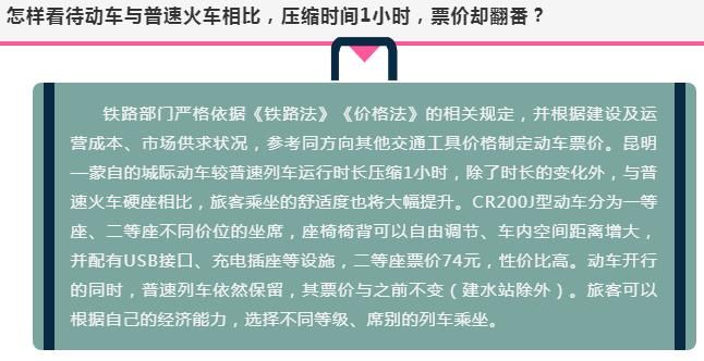 此前,在12月29日中國鐵路昆明局集團(tuán)召開的新聞發(fā)布會上就旅客最關(guān)心的票價問題,相關(guān)人士表示,動車票價嚴(yán)格依據(jù)《鐵路法》《價格法》的相關(guān)規(guī)定,根據(jù)建設(shè)及運(yùn)營成本,市場供求狀況,參考同方向其他交通工具價格制定動車票價。麗江、蒙自動車票價執(zhí)行浮動機(jī)制,即根據(jù)不同季節(jié)、不同日期、不同時段等市場因素,實(shí)行不同的票價。
