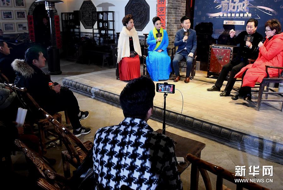 2018年12月31日,河南鄭州“戲緣·建業(yè)大食堂”上演網(wǎng)絡(luò)戲曲盛會。戲曲遇上互聯(lián)網(wǎng),碰撞出千萬級流量。當晚舉行的“出彩河南有好戲·2019新年網(wǎng)絡(luò)戲曲演唱會”上,豫劇名家李樹建、黃梅戲名家楊俊、青年京劇名家姜亦珊、徽劇名家汪育殊、曲劇名家劉艷麗等多劇種12位藝術(shù)家作為戲曲網(wǎng)絡(luò)傳播大使,為全國戲迷帶來視聽盛宴,共同迎接新年。新華社 記者李安/攝