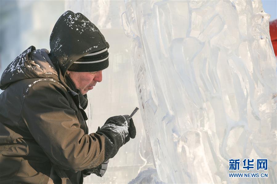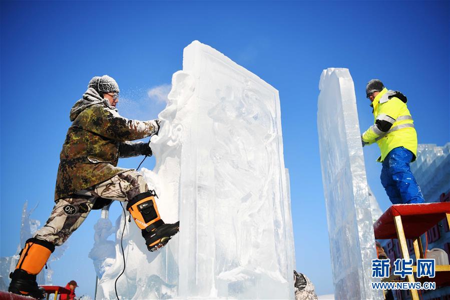 1月2日,選手在哈爾濱冰雪大世界內(nèi)制作冰雕。 新華社記者 王建威/攝