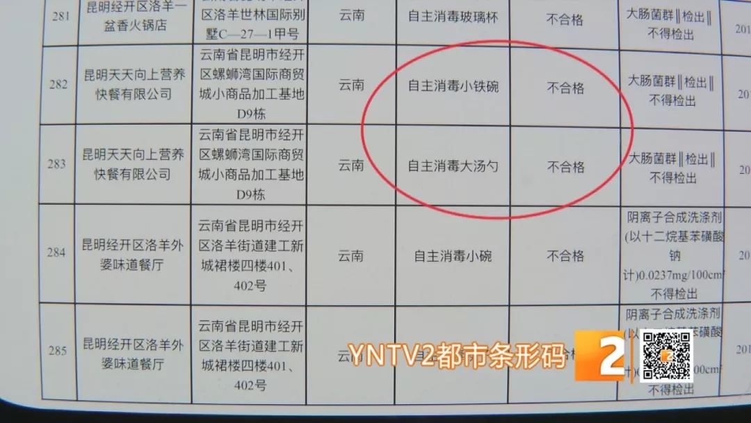 12月17日,昆明市食藥監(jiān)局官網(wǎng)發(fā)布公告,2018年9月下旬至10月底,在全市范圍內(nèi)組織對餐飲單位開展監(jiān)督抽檢,總共抽檢285批次,其中18批次不合格。而在此次不合格的名單里,就有昆明天天向上營養(yǎng)快餐公司。檢驗結(jié)果第282項、第283項顯示,昆明天天向上營養(yǎng)快餐有限公司自主消毒小鐵碗和自主消毒大湯勺抽檢不合格,檢出大腸菌群。