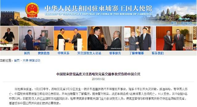 據(jù)中國(guó)駐柬埔寨王國(guó)大使館網(wǎng)站1月2日發(fā)布的消息稱,柬埔寨西哈努克省2日中午發(fā)生重大車禍,導(dǎo)致1人死亡,15人受傷,傷者中包括8名中國(guó)公民。