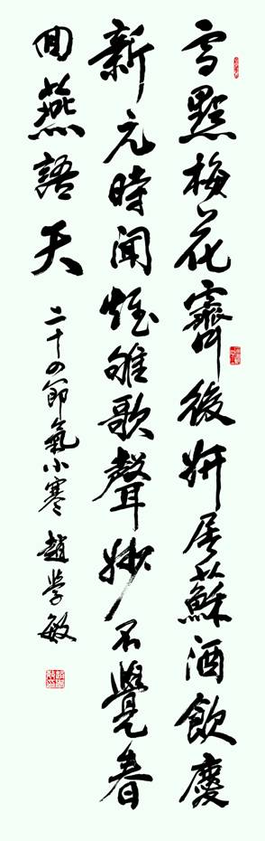 趙學敏先生《小寒》一詩,屬于典型節(jié)氣詩歌,雪后盛開的梅花,暢飲屠蘇酒,雉雊鳥清脆的叫聲,和小寒前后新元慶新年等,小寒節(jié)氣物候的特點都表現(xiàn)出來了,特別是整首詩上下聯(lián)系緊密,用詞生動形象,好似一幅山水油畫,或者一幅草書作品,一氣呵成!起句“雪點梅花霽后妍”的“點”字,承句“屠蘇酒飲慶新元”的“慶”字,還有轉句雉雊鳥的叫聲,都是象聲詞,惟妙惟肖,把小寒節(jié)氣寫活了!雉雊是一種十分敏感的飛禽,在小寒節(jié)令陽氣上升時,發(fā)出鳴叫,使人沉醉在梅開鮮艷、新元酒慶和雉雊唱歌的佳境之中,留戀忘返。尤其是合句“不覺春回燕語天”,最是精彩感人,同前三句聯(lián)系起來,人們沉浸在歡慶新元的歡樂中,不感覺到小寒的寒冷,自然的回到春回大地,鳥語花香的春天!