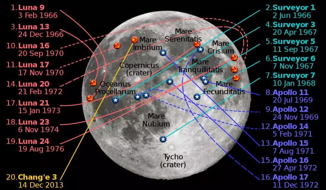 到中國嫦娥三號時,人類已經(jīng)在月球正面有過20個著陸器,然而背面為0(圖源:Wikipedia)