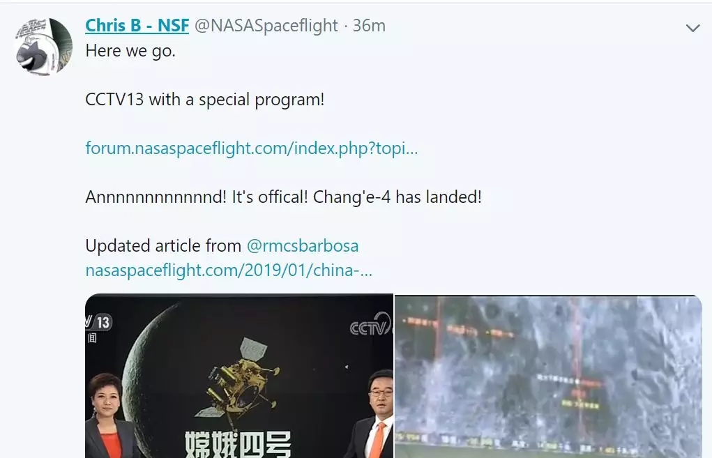 央視13臺報了!官宣了!嫦娥4號登陸了!