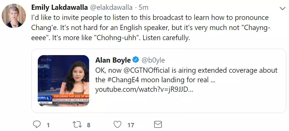 另外,有外國的科技媒體人目前還在認真學習到底該怎么正確地讀出“嫦娥”倆字: