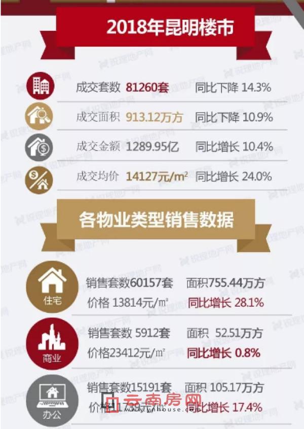 具體到各類物業(yè)銷售數(shù)據(jù)來看,2018年昆明商品住宅賣出了60157套,成交面積755.44萬平方米,全年成交均價13814元/平米,價格同比上漲了28.1%,一年的價格漲幅接近3成。