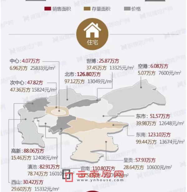 在銳理劃分的昆明城區(qū)十二個板塊中(昆明中心、次中心、世博、北市、官南、滇池、西山、呈貢、東南、空港、高新、東市),2018年北市板塊新建商品住宅成交面積126.8萬平方米,是賣房面積最多的區(qū)域,其次是東南板塊和官南板塊,賣房面積分別為123.1萬平方米、110.08萬平方米。