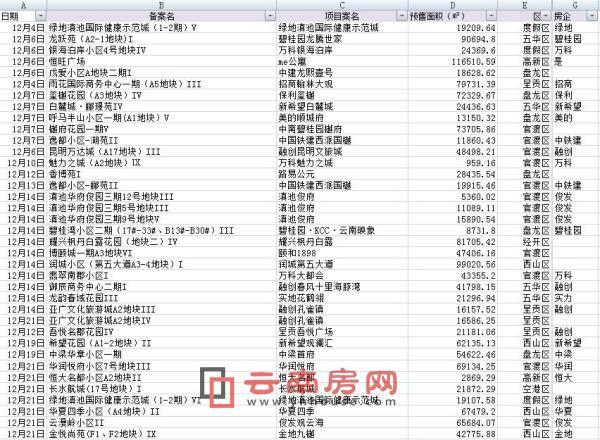 12月昆明部分領(lǐng)預(yù)售證的項(xiàng)目及獲批預(yù)售面積