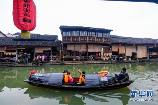 1月6日,游客乘坐傳統(tǒng)烏篷船游覽安昌古鎮(zhèn)。新華社記者 徐昱/攝