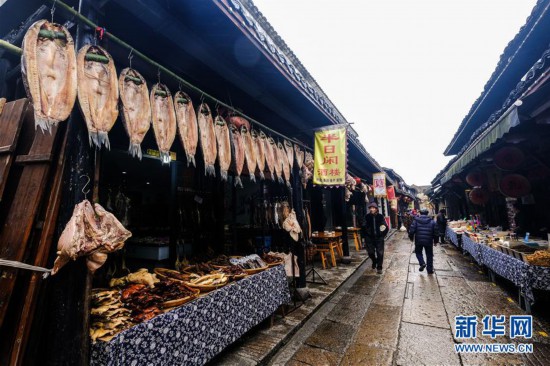 1月6日,安昌古鎮(zhèn)的老街上掛著各種傳統(tǒng)臘味食品,洋溢著濃濃的年味。 新華社記者 徐昱/攝